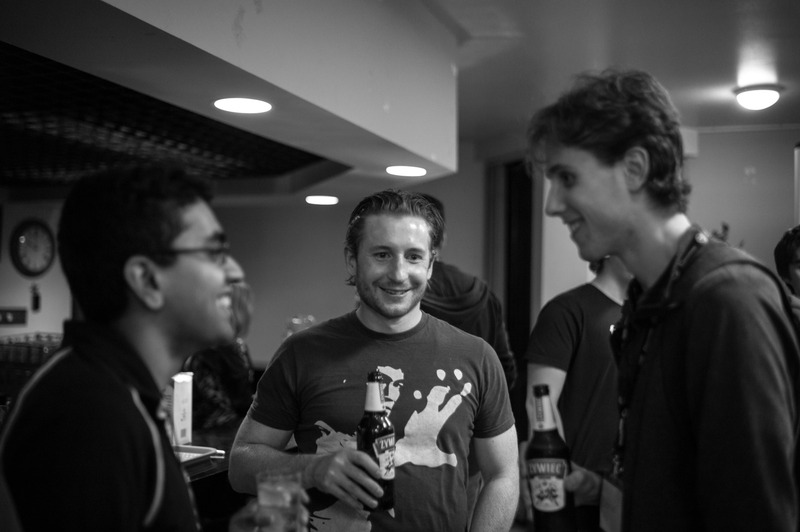 In a dimly lit room, a trio of friends engages in lively conversation, their expressions radiating warmth and camaraderie. The blurred background adds a sense of intimacy, enhancing the focus on their animated interactions. The monochrome tones evoke a nostalgic mood, hinting at a memorable gathering on a cozy evening.