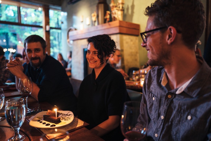 In a warmly lit restaurant, three friends enjoy an intimate gathering marked by laughter and joy. The center of the composition is a decadent dessert adorned with a candle, symbolizing a special occasion and capturing the essence of celebration amidst a cozy ambiance.