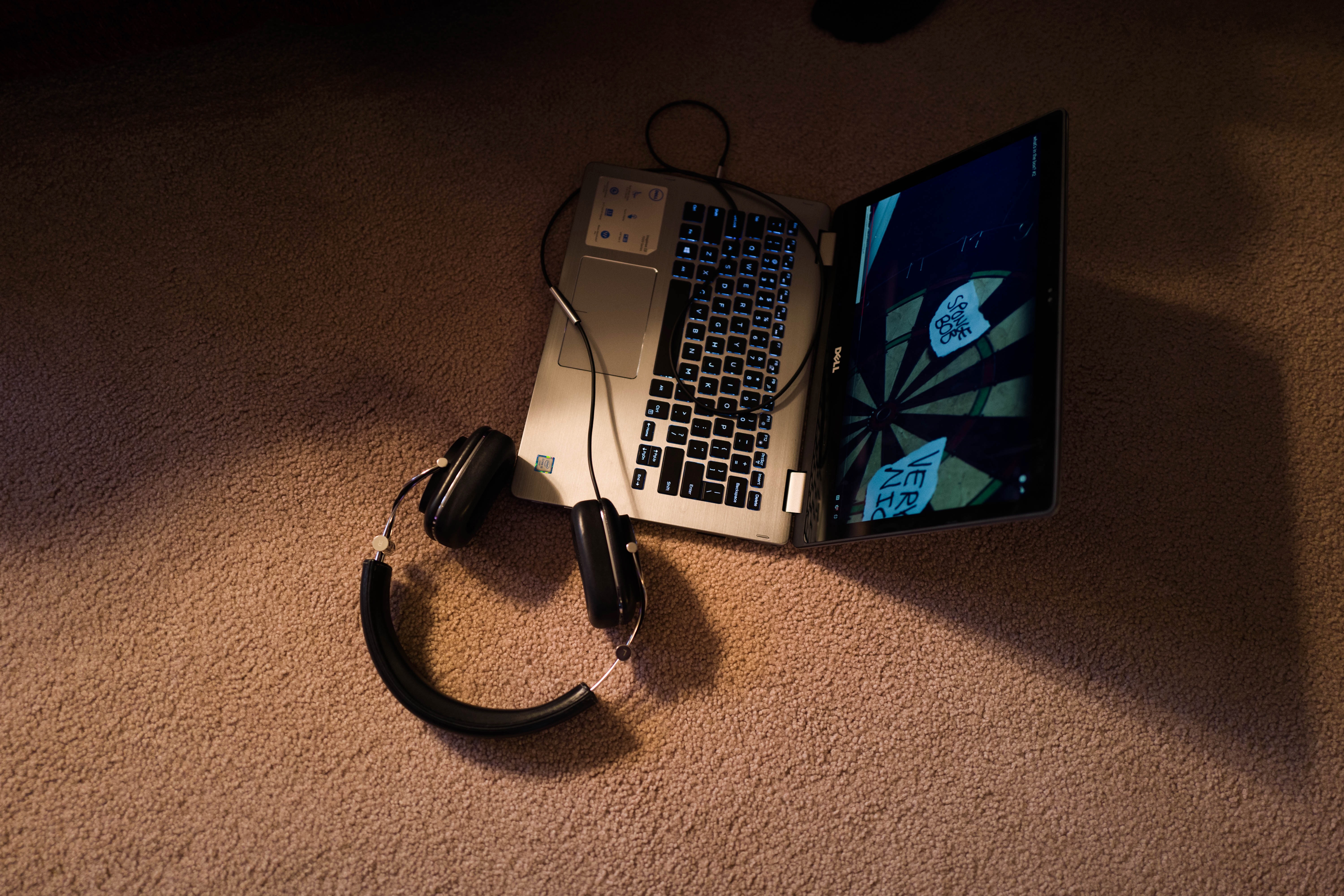 An open laptop rests on soft carpet, showcasing a vibrant display that captures the viewer's attention. A pair of black headphones lay casually beside it, suggesting a blend of creativity and relaxation. The warm, subdued lighting creates an intimate atmosphere, perfect for introspective moments or focused work.