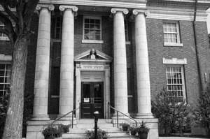 The photograph captures the stately entrance of a historic building framed by grand columns and lush greenery. The black and white composition emphasizes the architectural details and evokes a sense of nostalgia, while the gentle lighting enhances the textures of the brick and stone. With its inviting steps leading to the door, the scene conveys a quiet dignity and a welcoming atmosphere.