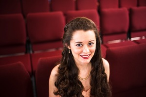 The photograph captures a young woman with a radiant smile, seated against a backdrop of plush red theater chairs. Soft, natural lighting illuminates her features, enhancing the glimmer in her eyes and the texture of her cascading curls, creating an inviting and warm atmosphere. The composition draws attention to her poised expression, contrasting effectively with the rich tones of the seating behind her.