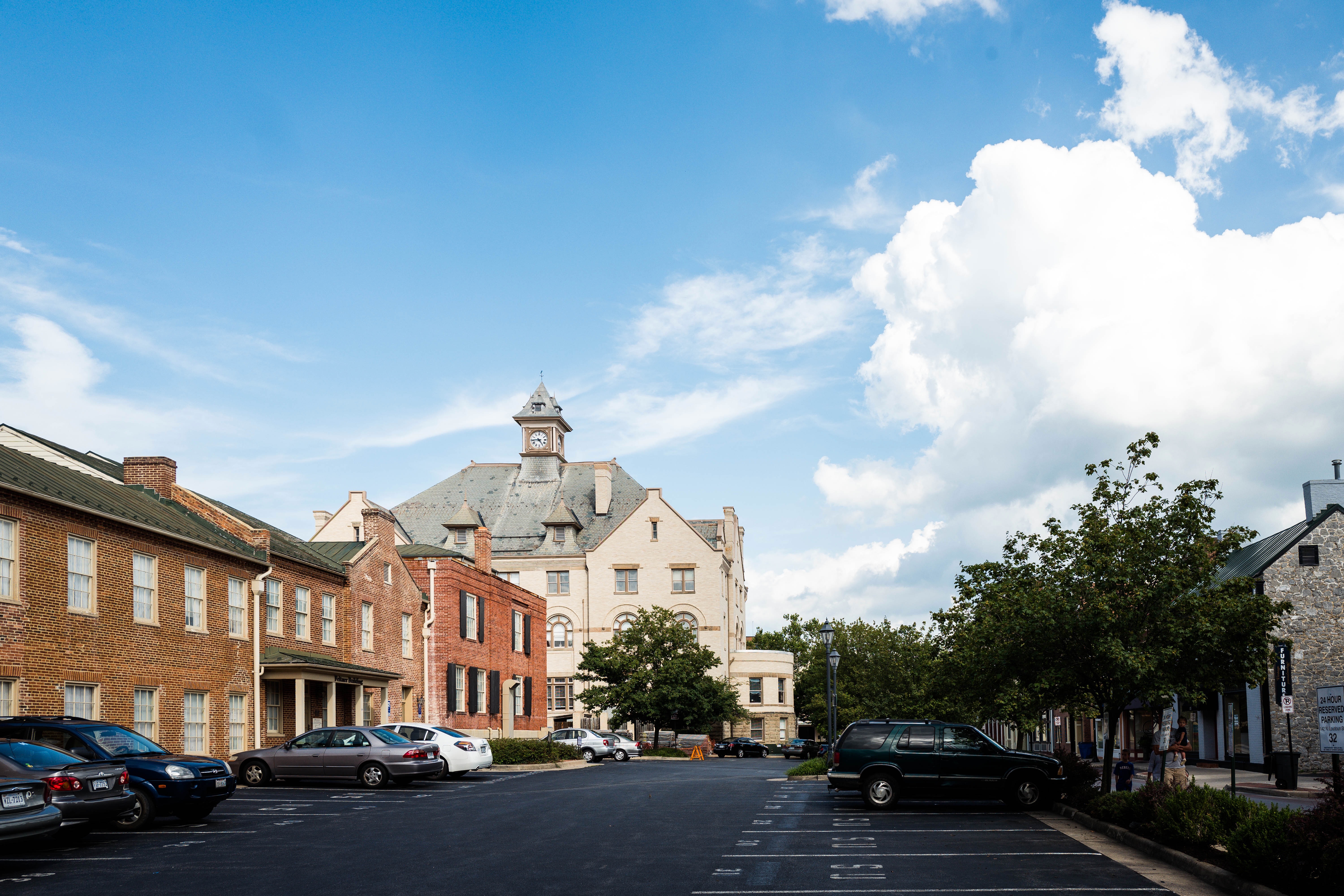 The photograph captures a charming street lined with well-preserved brick buildings and vehicles, drawing the eye toward a prominent clock tower that hints at the area's history. The bright blue sky is punctuated by fluffy clouds, creating a light and inviting atmosphere. Warm sunlight bathes the scene, enhancing the textures of the architecture and the vibrant greenery, evoking a sense of nostalgia and community.