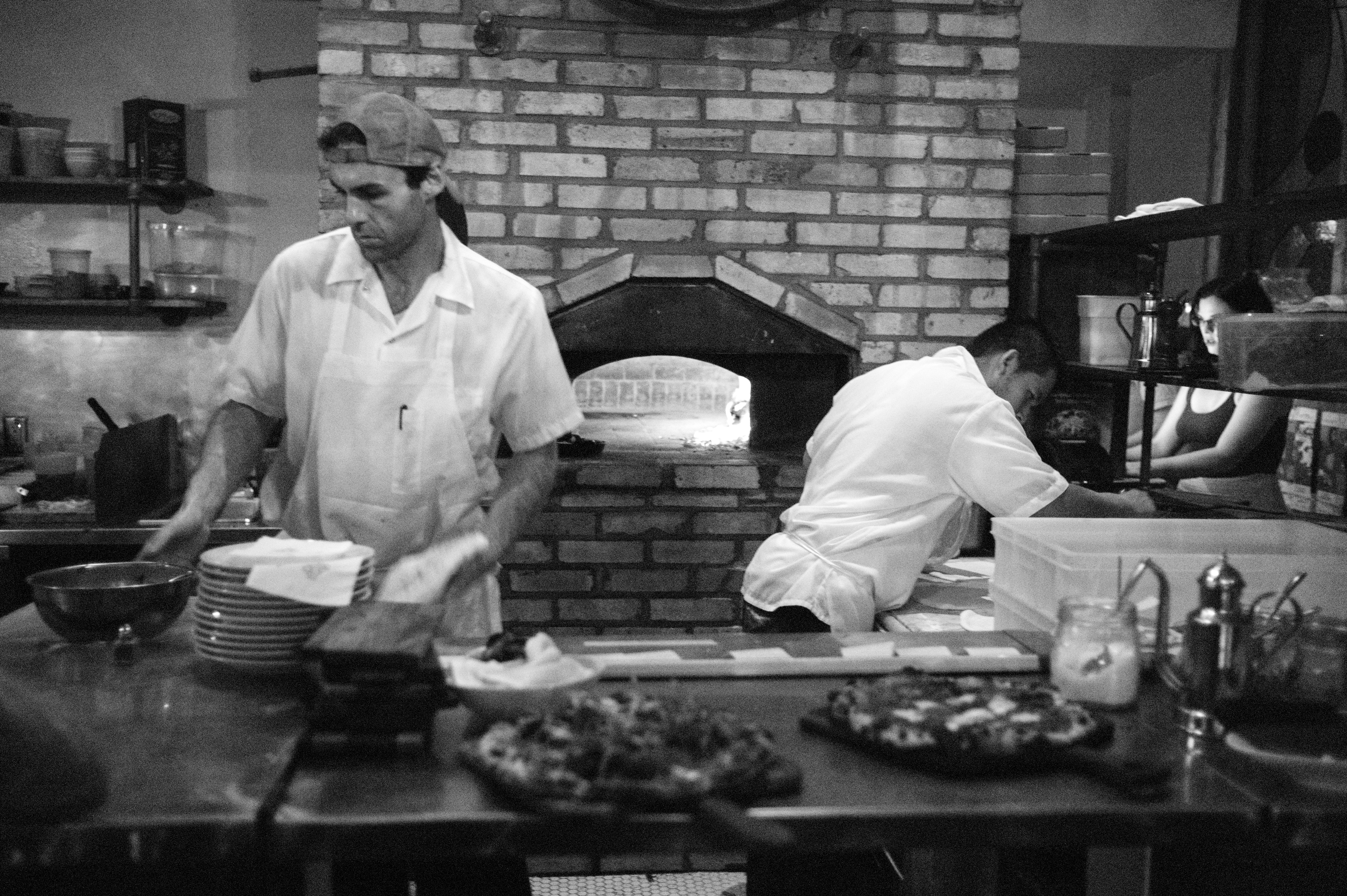 In this black-and-white photograph, two chefs intensely focus on their tasks in a bustling kitchen, amidst the warm glow of a brick oven. The mood captures a blend of urgency and camaraderie, highlighted by the stark contrasts of light and shadow. The composition draws the viewer's eye to the preparation area, showcasing an array of dishes waiting to be plated, embodying the heart of culinary creativity.