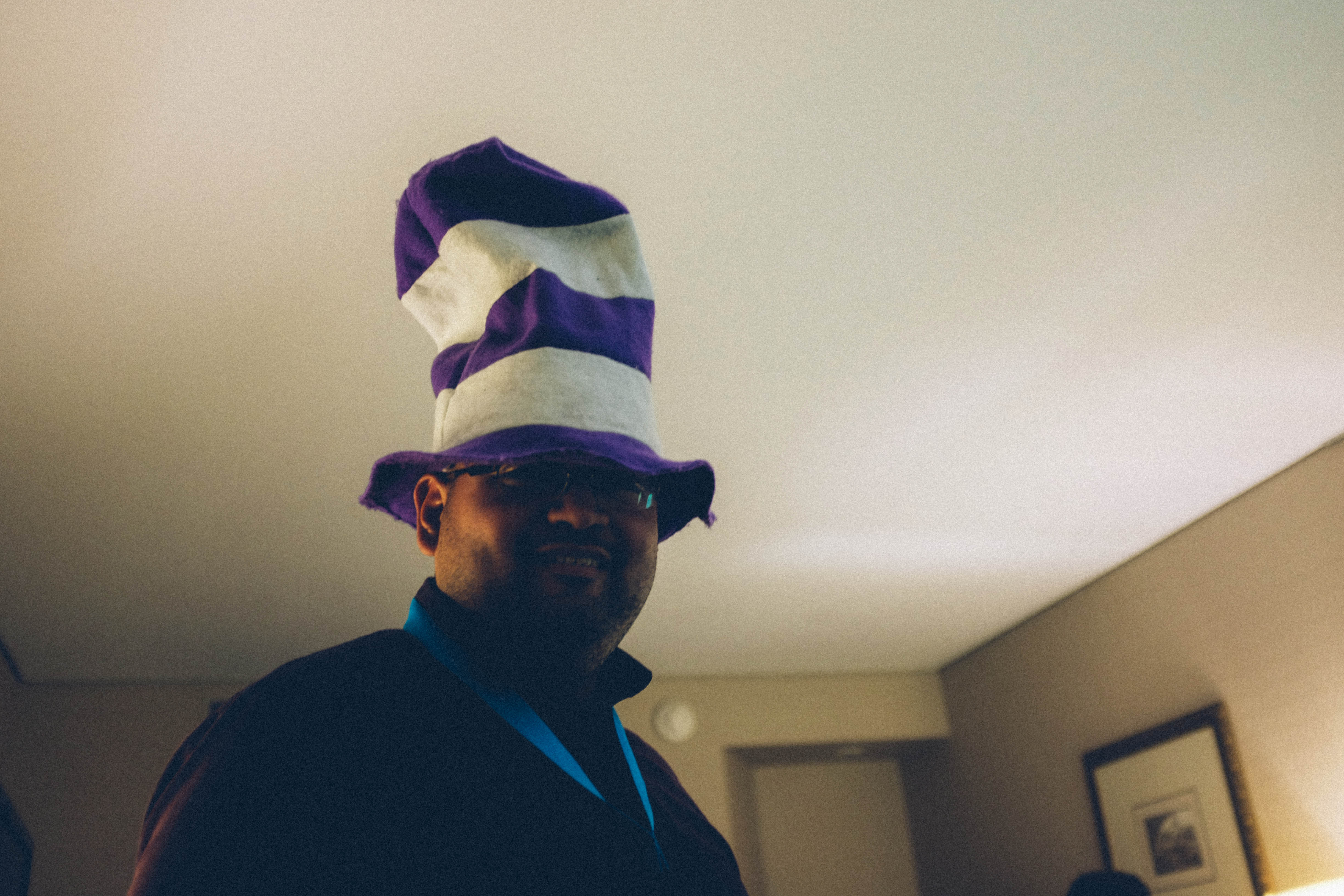 A man stands confidently in a vibrant purple and white striped hat, exuding a playful spirit. The soft, diffused lighting enhances the intimate atmosphere of the room, setting a relaxed mood. His slight smile suggests a moment of joy, capturing the essence of a fun gathering.