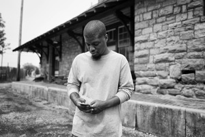 In this black-and-white photograph, a young man stands absorbed in his phone, exuding a sense of introspection amidst the rustic backdrop of an old train station. The soft, diffused lighting enhances the mood of solitude and contemplation, while the textured stone wall complements his thoughtful demeanor. The composition draws the viewer's eye towards his focused expression, emphasizing the contrast between his modern device and the historic setting.