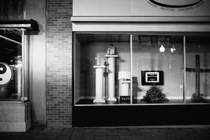 This photograph captures a juxtaposition of two storefronts, one featuring a yin-yang symbol and the other showcasing a display of columns adorned with symbols of faith. The black and white composition evokes a contemplative mood, highlighting the contrasts between spirituality and philosophy. Soft lighting enhances the clarity of the display, inviting viewers to reflect on the interplay between belief systems.