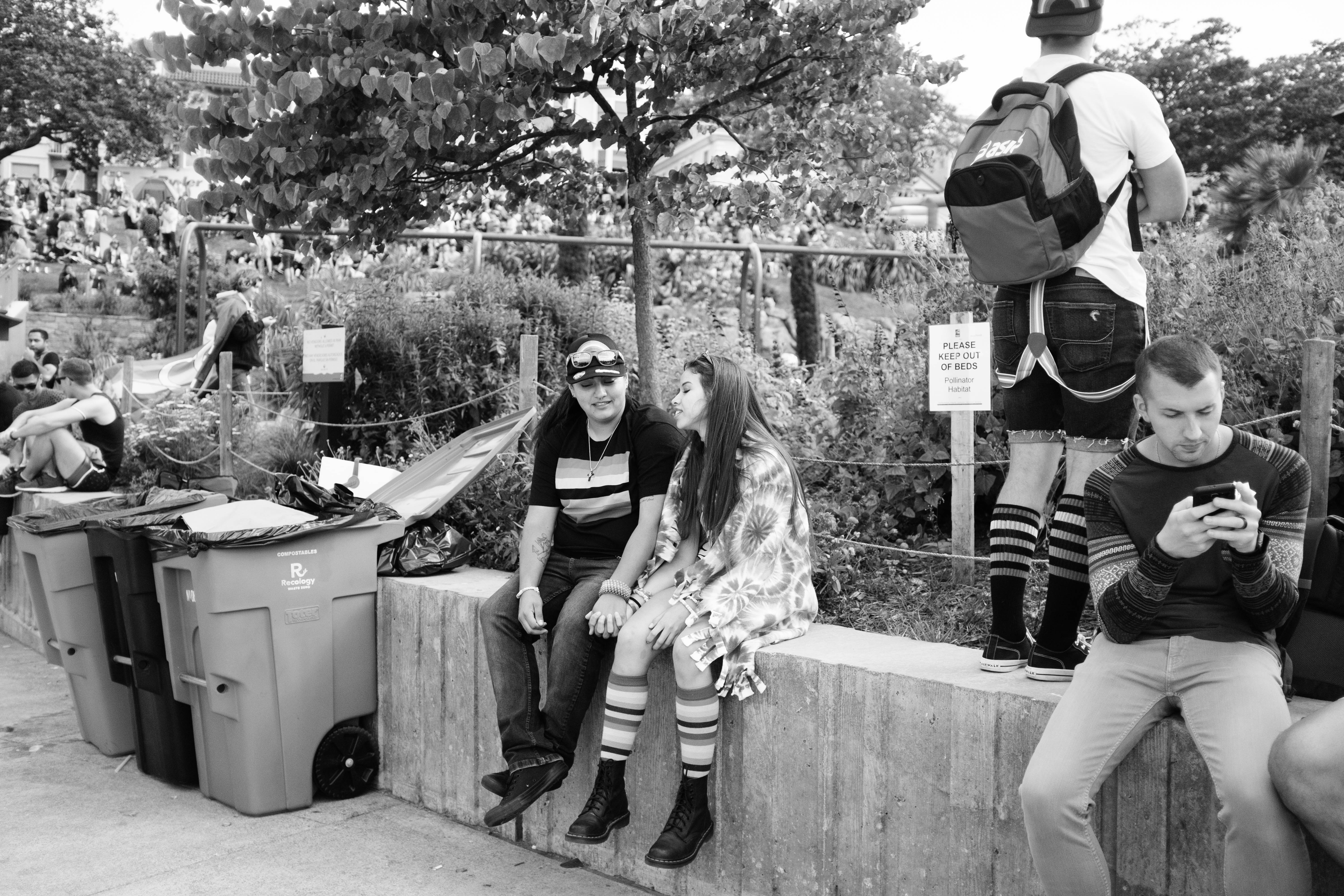 In this candid black-and-white photograph, two friends share an intimate moment on a concrete ledge, their expressions conveying a mixture of joy and introspection. The vibrant greenery and busy background contrast with the muted tones of the foreground, lending a sense of nostalgia to the urban setting. The composition draws the viewer's eye to the couple, while other figures in the distance add a layer of complexity to the scene.
