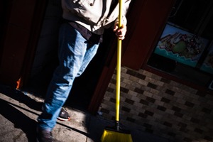 A figure in casual attire sweeps the sidewalk with a bright yellow broom, exuding a sense of diligent routine. The composition captures movement, contrasting the static shopfront behind with diagonal lines and vivid shadows. The interplay of light and shadow hints at a bustling yet intimate urban atmosphere, evoking both energy and calmness in the day-to-day grind.