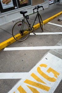 In an urban setting, a solitary bicycle leans against a yellow curb, embodying a moment of tranquility amidst the bustling surroundings. The composition emphasizes the contrast between the bike and the vibrant yellow and white parking lines, creating a sense of isolation and serenity. Soft, subdued lighting lends a contemplative mood to this everyday scene, inviting viewers to reflect on the quiet beauty of urban life.