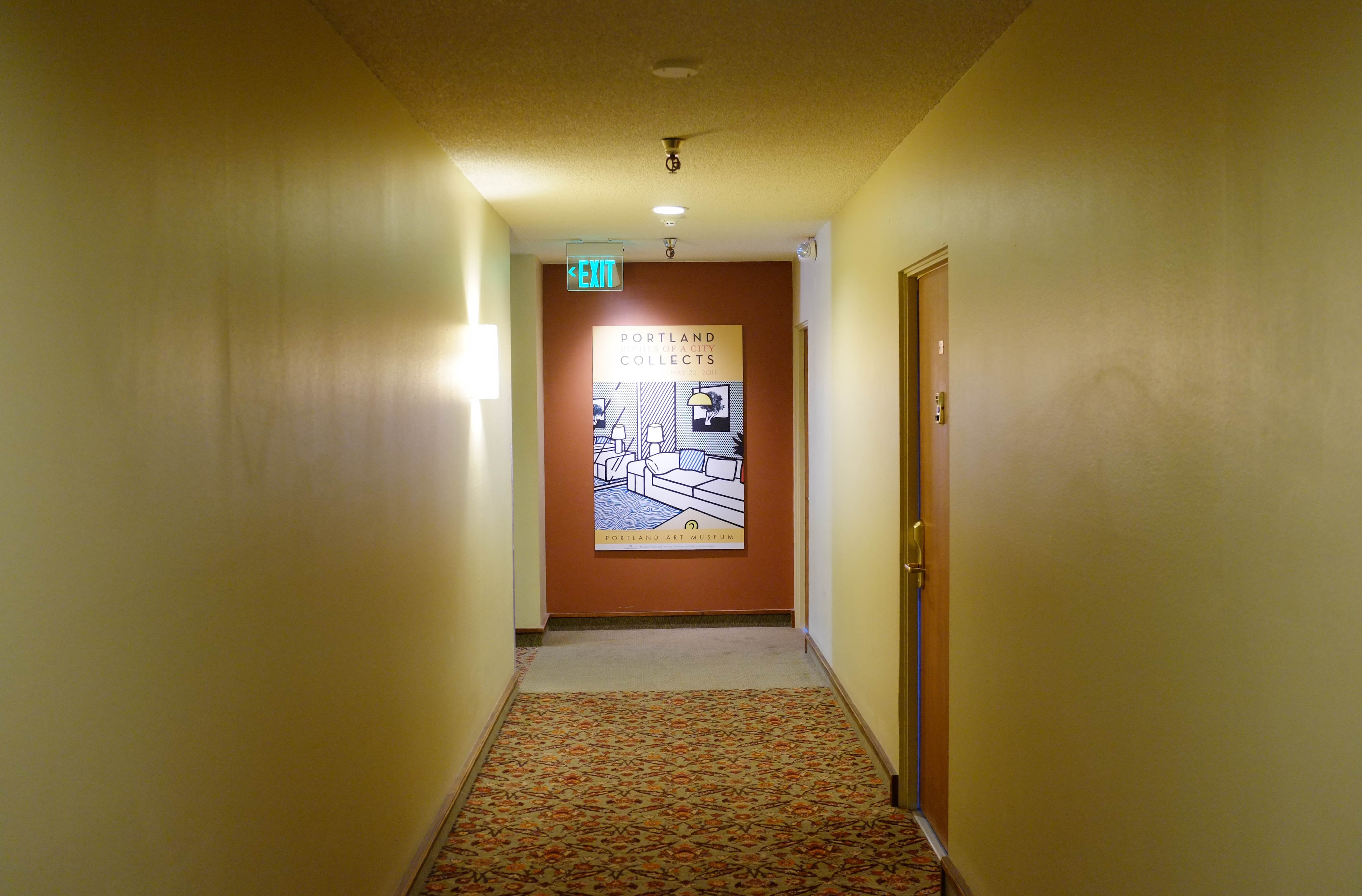 The photograph captures a serene hotel hallway, lined with soft yellow walls and warm lighting. The focal point is a bold art display that adds a pop of color to the muted surroundings, infusing the space with a hint of culture. The carpeted floor and dimly lit corners evoke a sense of calmness and anticipation, inviting exploration.