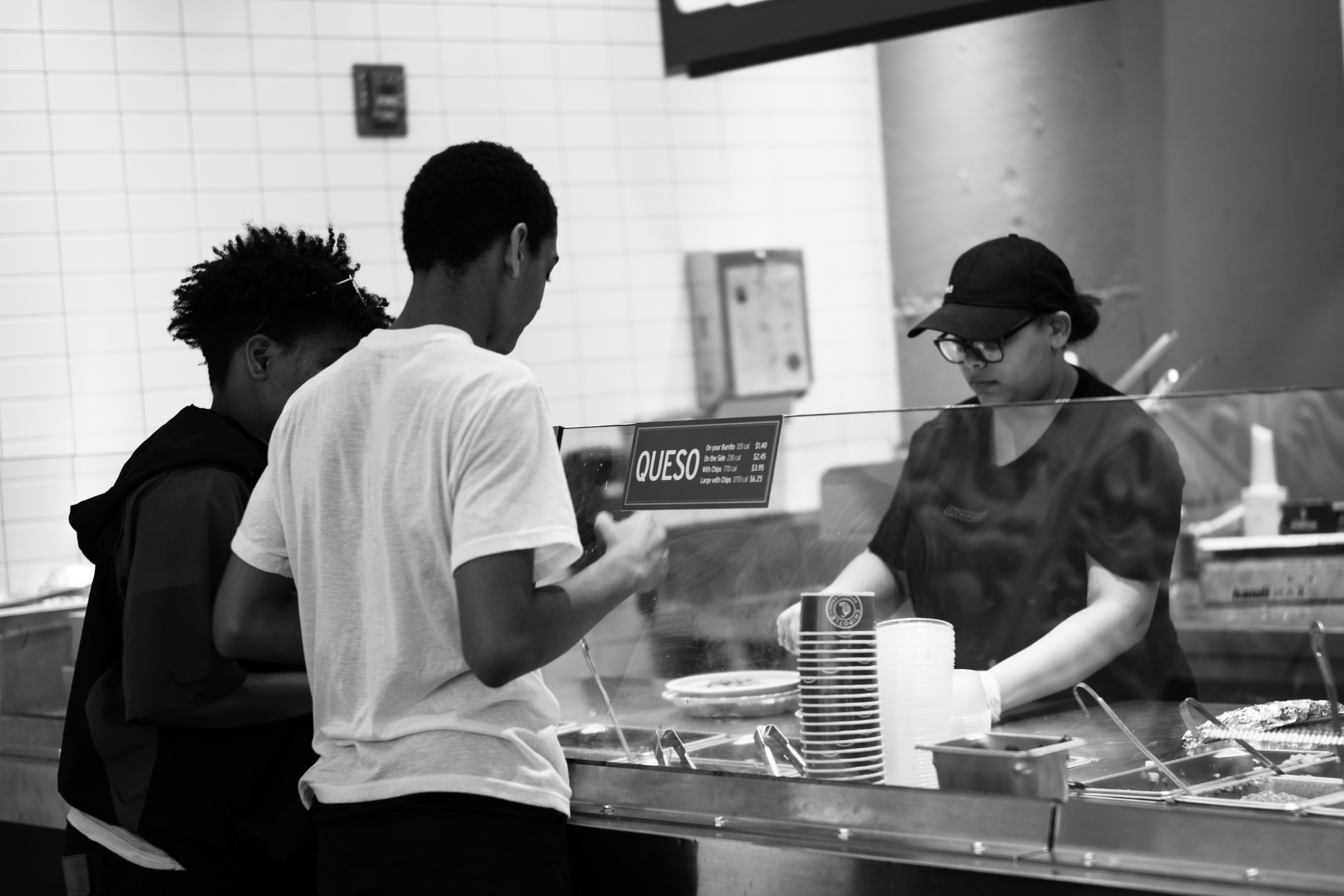 In a minimalist black-and-white setting, two young patrons lean forward, engaged in lively decision-making at a food counter, while a focused worker prepares their meal. The composition draws attention to the interplay between the customer anticipation and the dedicated service behind the glass, creating a moment rich in everyday connection. Soft, diffused lighting enhances the intimate atmosphere, emphasizing the simple yet vibrant energy of the dining experience.