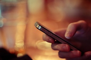 A close-up of a hand delicately holding a smartphone, capturing an intimate moment of digital engagement. The warm, soft lighting creates a cozy atmosphere, highlighted by the subtle glow of distant reflections. The blurred background emphasizes the focus on the phone, evoking a sense of solitude amidst a bustling environment.