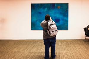 A solitary figure stands in contemplation before a large, soothing blue painting, creating an atmosphere of introspection and wonder. The soft lighting casts a gentle glow, accentuating the vibrant colors of the artwork while the subdued, neutral backdrop and floor grounding the scene. The man's casual attire and backpack suggest a relatable, everyday encounter with art, enhancing the sense of personal connection to the creative space.
