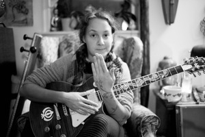 In a cozy, dimly lit room, a woman with intricate tattoos holds a guitar, her hand raised as if to signify a moment of quiet reflection. The monochrome tones enhance the intimate atmosphere, with soft shadows casting over her thoughtful expression, inviting a sense of connection and contemplation. Plush furnishings and personal artifacts in the background harmonize with her relaxed posture, creating a scene rich in artistry and emotion.