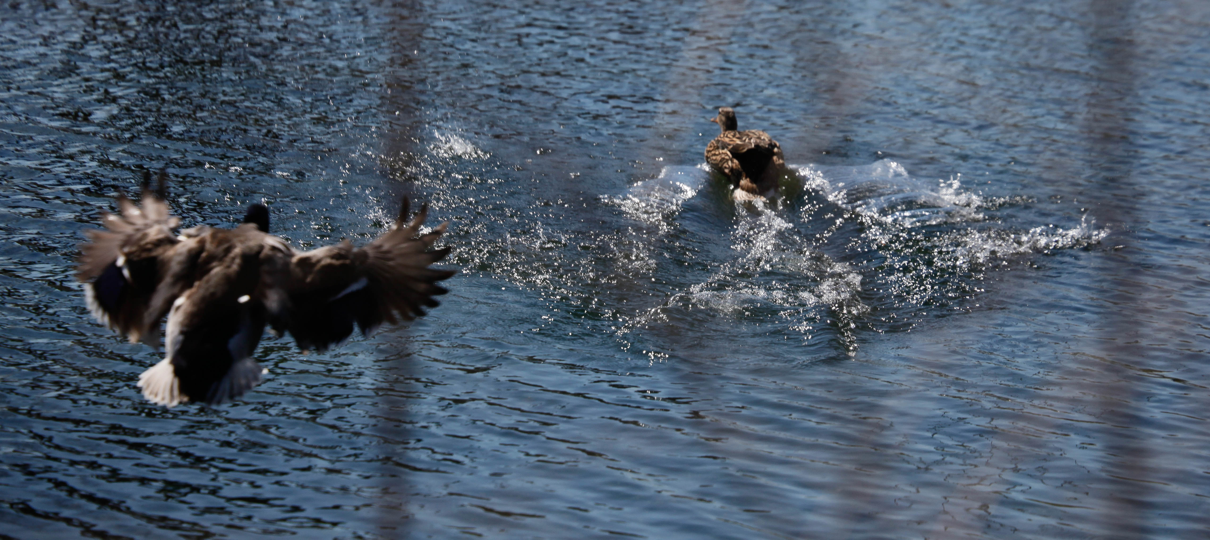 The photograph captures a moment of dynamic motion as two ducks engage with their watery environment. One duck takes flight, its wings spread wide, while the other creates splashes as it swims, illustrating the vibrant life at the water's edge. Bright sunlight enhances the scene, casting reflections on the water and adding a sense of warmth and energy to the composition.
