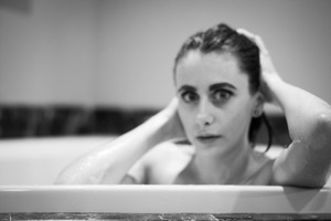In this striking black-and-white photograph, a young woman emerges from the edge of a bath, her hands tangled in her wet hair. The soft focus creates an intimate atmosphere, emphasizing her contemplative expression against the subtle backdrop of the room. The lighting casts gentle shadows, enhancing the mood of introspection and vulnerability.