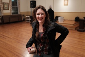 In a spacious, softly lit hall, a young woman beams with joy, holding a small object in her hands. The warm wooden floor and muted surroundings emphasize her infectious smile, creating a mood of warmth and camaraderie. Her casual attire and relaxed posture suggest a comfortable, informal gathering, adding to the inviting atmosphere.
