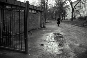 A solitary figure in a long coat walks down a gravel path, framed by a rusted gate and shadowy trees. The muted tones and reflective puddles on the ground create a somber yet introspective mood, inviting contemplation of solitude. The distant architecture adds a sense of place, contrasting the stark simplicity of the path ahead.