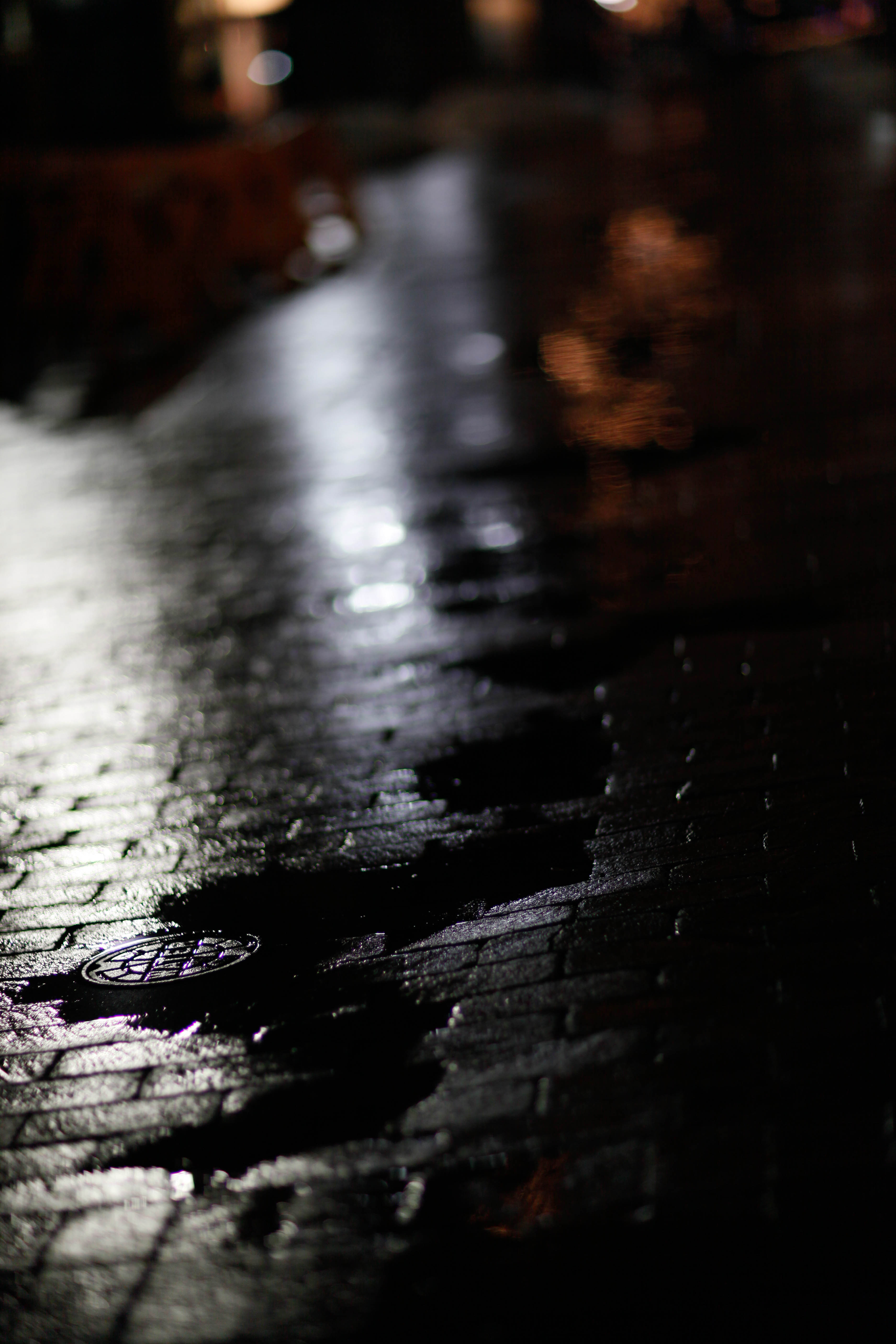 The photograph captures a dimly lit street, glistening with recent rain. Shadows and reflections dance across the slick pavement, creating a moody and contemplative atmosphere. The composition draws the eye down the cobblestone path, inviting viewers to explore the quiet, urban solitude.