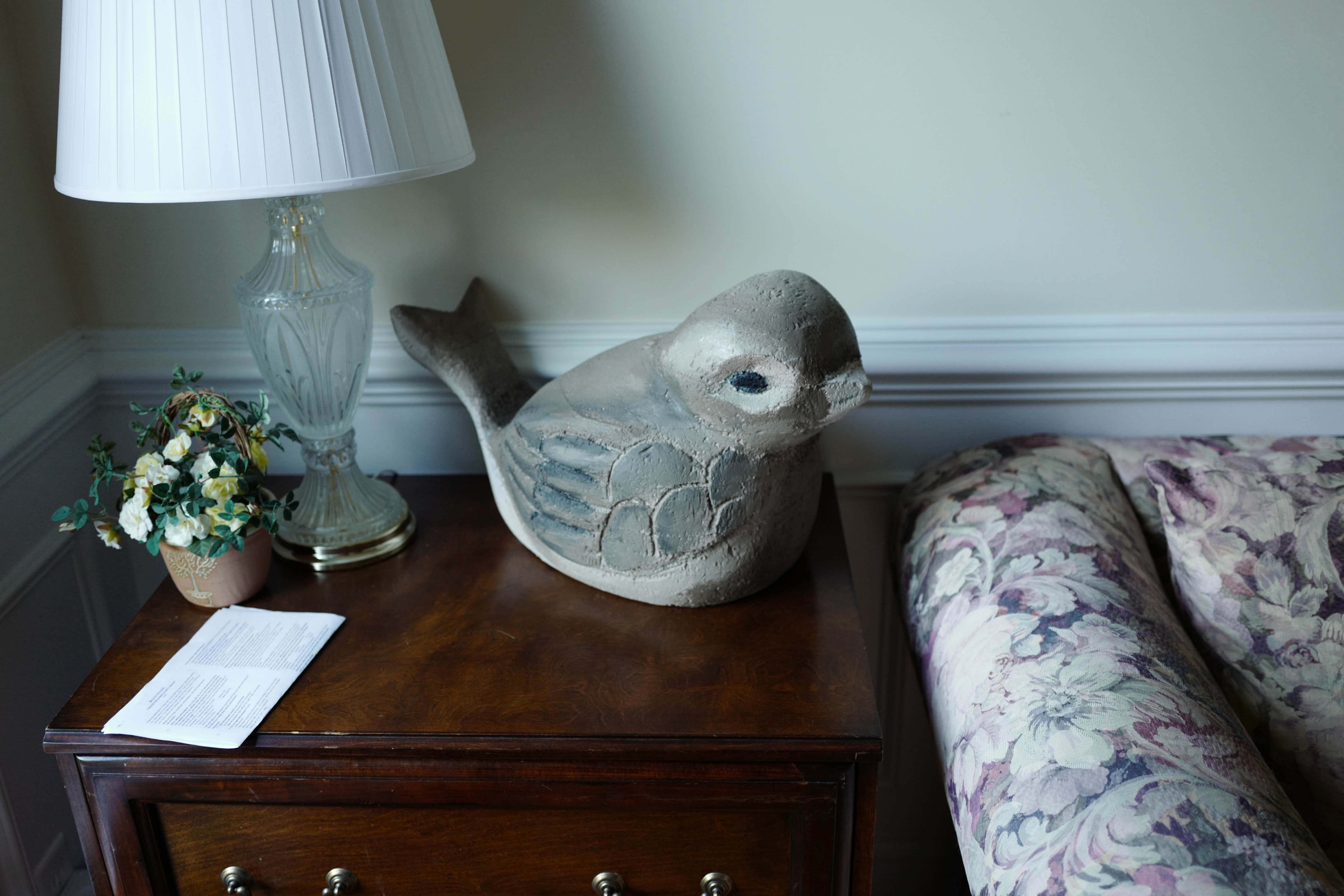 A charming ceramic bird sits atop a wooden nightstand, exuding a sense of calm and nostalgia. The soft, diffused light from a nearby lamp envelops the scene, highlighting the delicate textures of the bird and the floral patterns on the couch. A small bouquet of faux flowers adds warmth, creating a tranquil atmosphere perfect for reflection.
