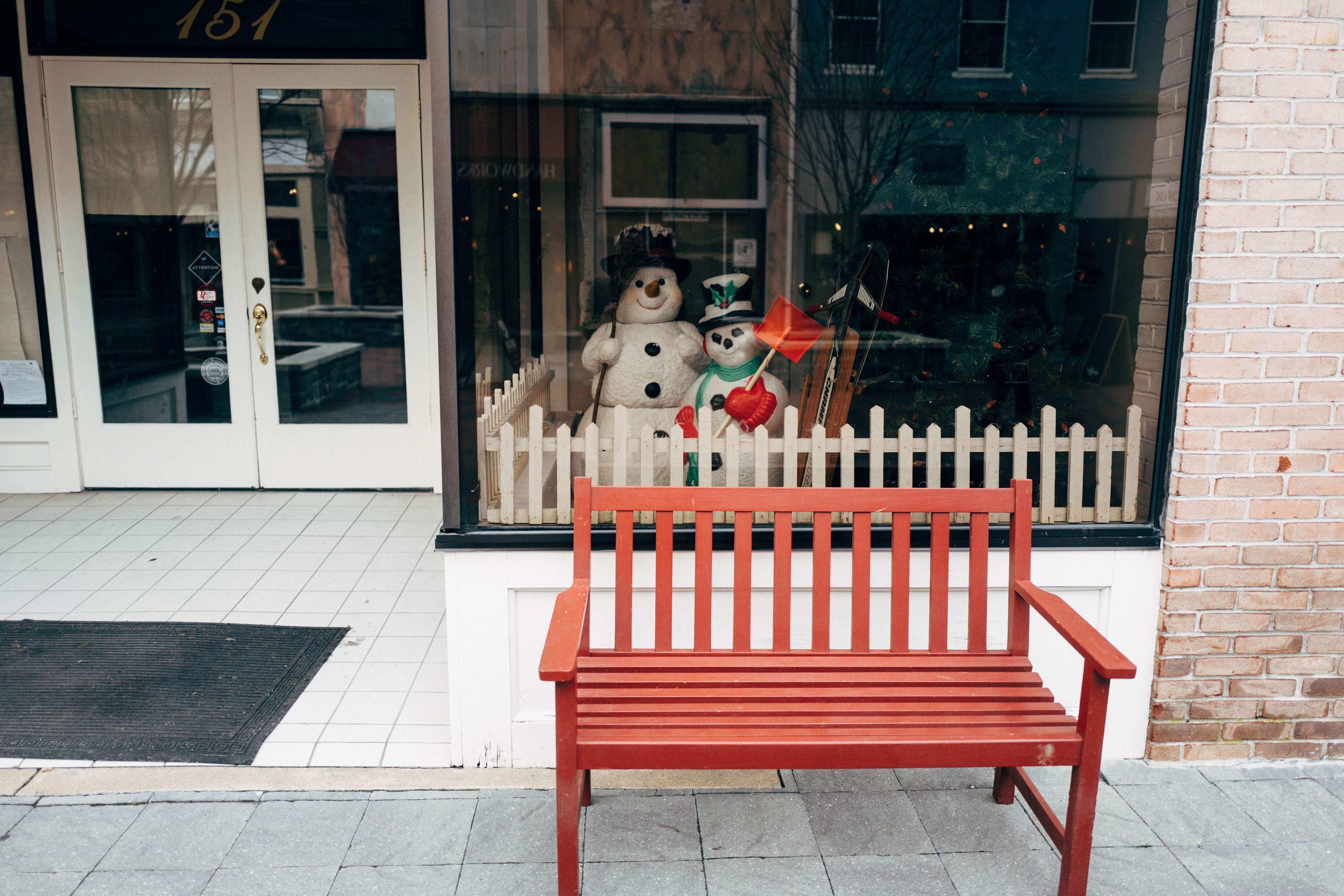 A vibrant red bench sits invitingly in front of a shop window, framing a whimsical display of snowmen adorned in festive gear. The soft, subdued lighting enhances the cozy, nostalgic mood, while the contrasting colors create visual interest. Outside, the quiet street reflects winter's charm, suggesting a sense of community warmth amidst the chilly season.