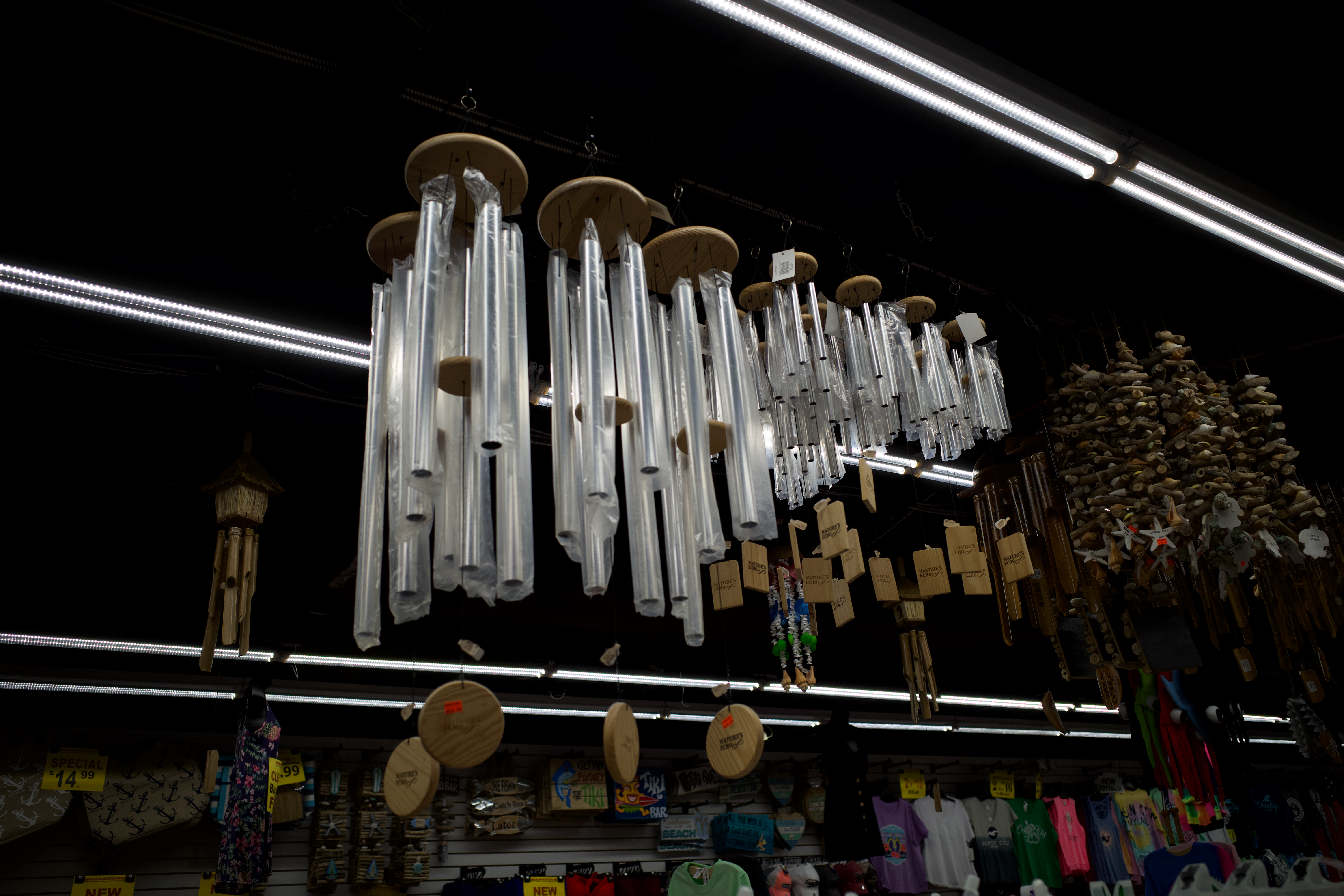 The photograph captures an intricate display of wind chimes hanging from above, each tube reflecting subtle glimmers of light. The dark background contrasts with the bright, linear lighting, creating a serene yet vibrant atmosphere. This composition invites a sense of calm, evoking the gentle sounds of chimes dancing in the breeze.