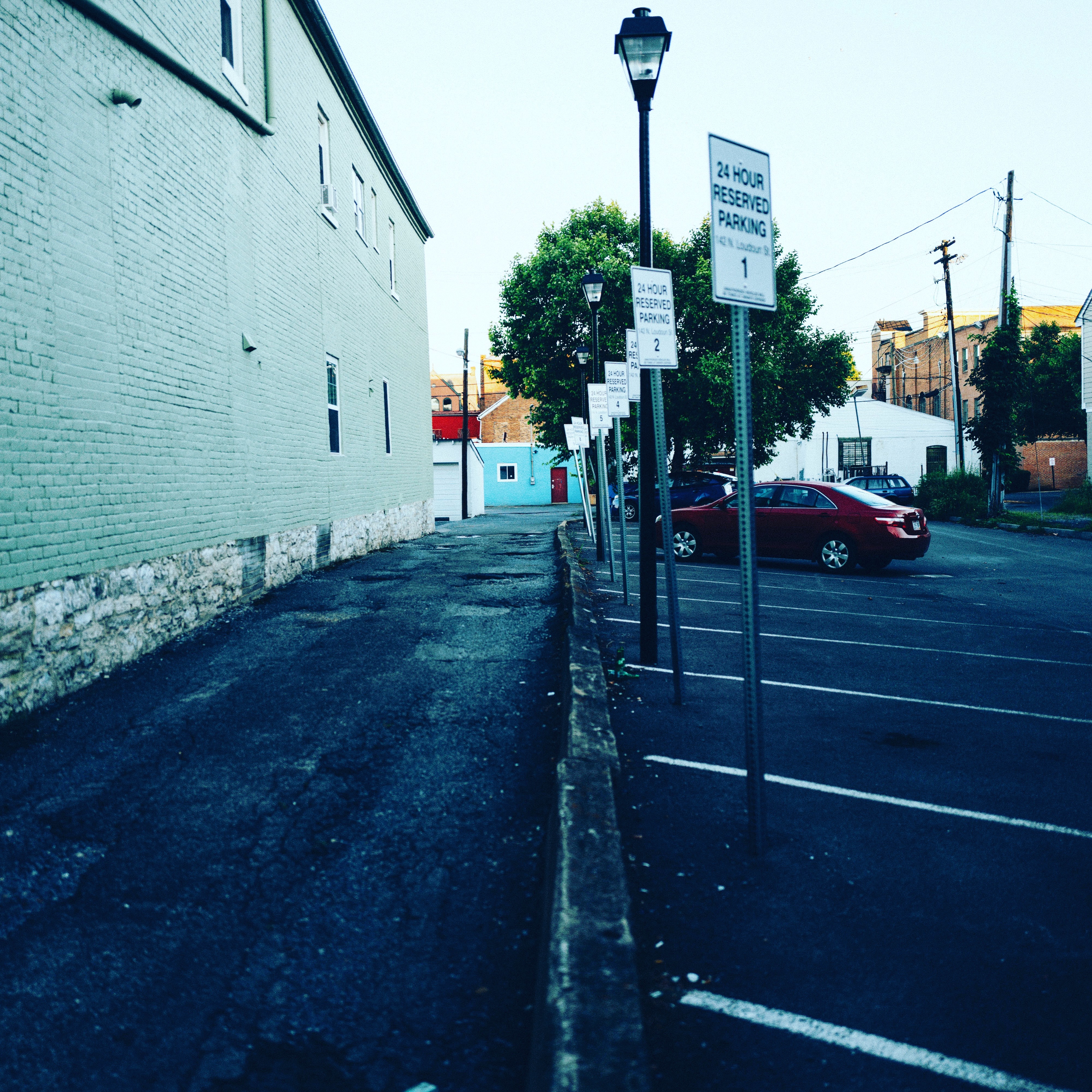 This photograph captures a narrow, desolate alleyway flanked by a pastel green building and rows of parking signposts. The soft morning light casts subtle shadows, enhancing the serene yet slightly melancholic mood of the scene. A solitary red car parked nearby adds a pop of color and a sense of life to the otherwise tranquil setting.