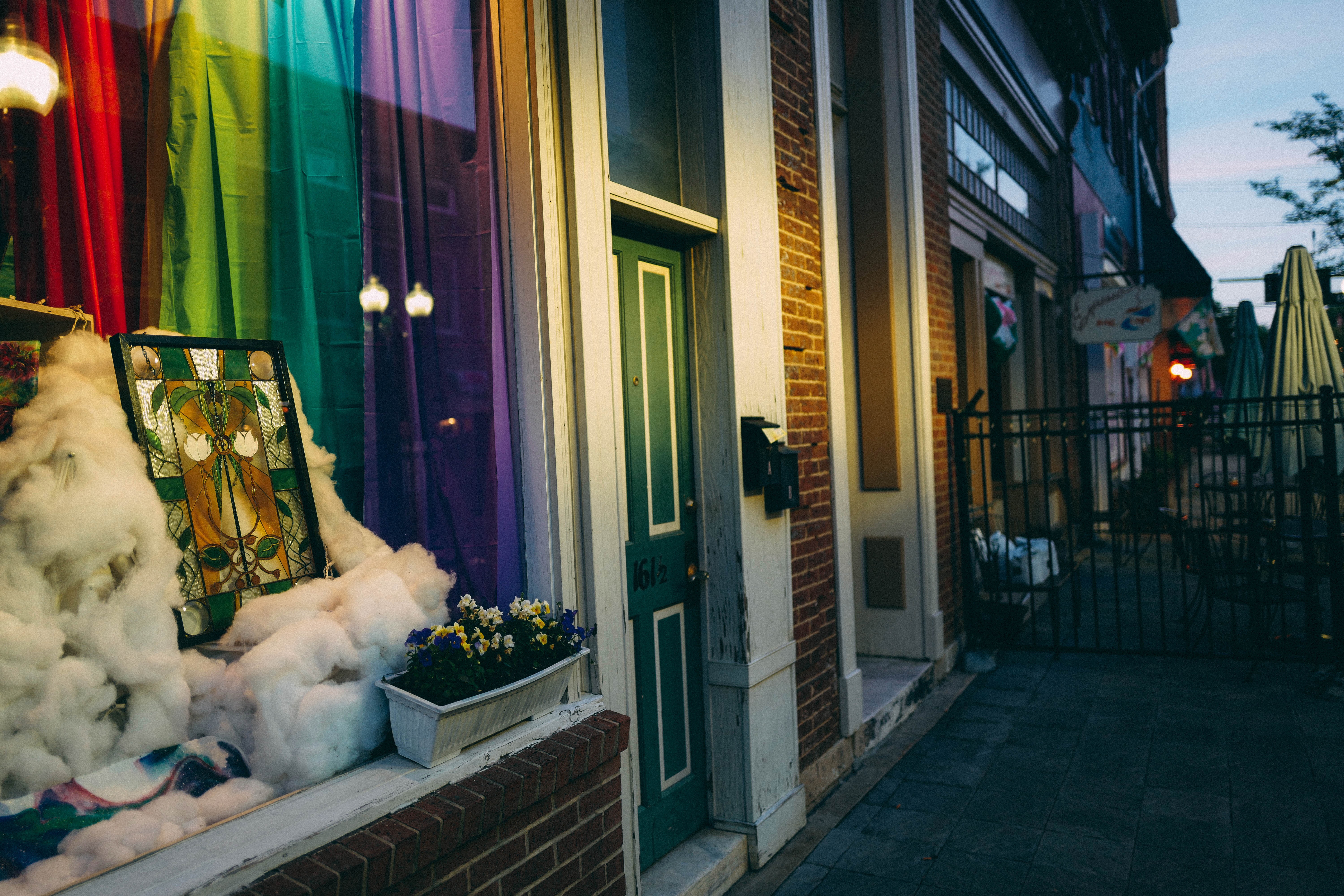 The photograph captures a quaint storefront, its window adorned with colorful rainbow curtains and whimsical decor, evoking a sense of joy and inclusivity. Soft, warm lighting bathes the entrance, contrasting with the cool tones of dusk, creating a cozy yet inviting atmosphere. The scene is framed by brick and plush cotton-like clouds, inviting the viewer into a moment of serene urban beauty, rich with artistic charm.