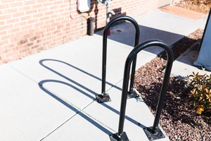 The photograph features two black bike racks standing against a backdrop of warm red brick, casting elongated shadows on the concrete sidewalk. Bright, natural light highlights the sleek lines and curves of the racks, creating a sense of calm and simplicity. The contrasting textures of the brick and pavement juxtapose the smooth metal, enhancing the overall minimalist aesthetic.