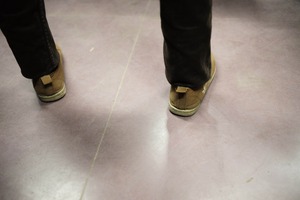 The photograph captures a close-up view of a pair of casual shoes positioned on a pale, textured floor. The muted lighting and soft shadows evoke a sense of stillness and contemplation, inviting the viewer to reflect on the moment's simplicity. The composition leads the eye downward, emphasizing both the shoes and the connection to the ground beneath them.
