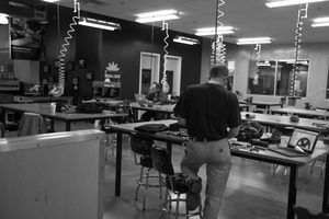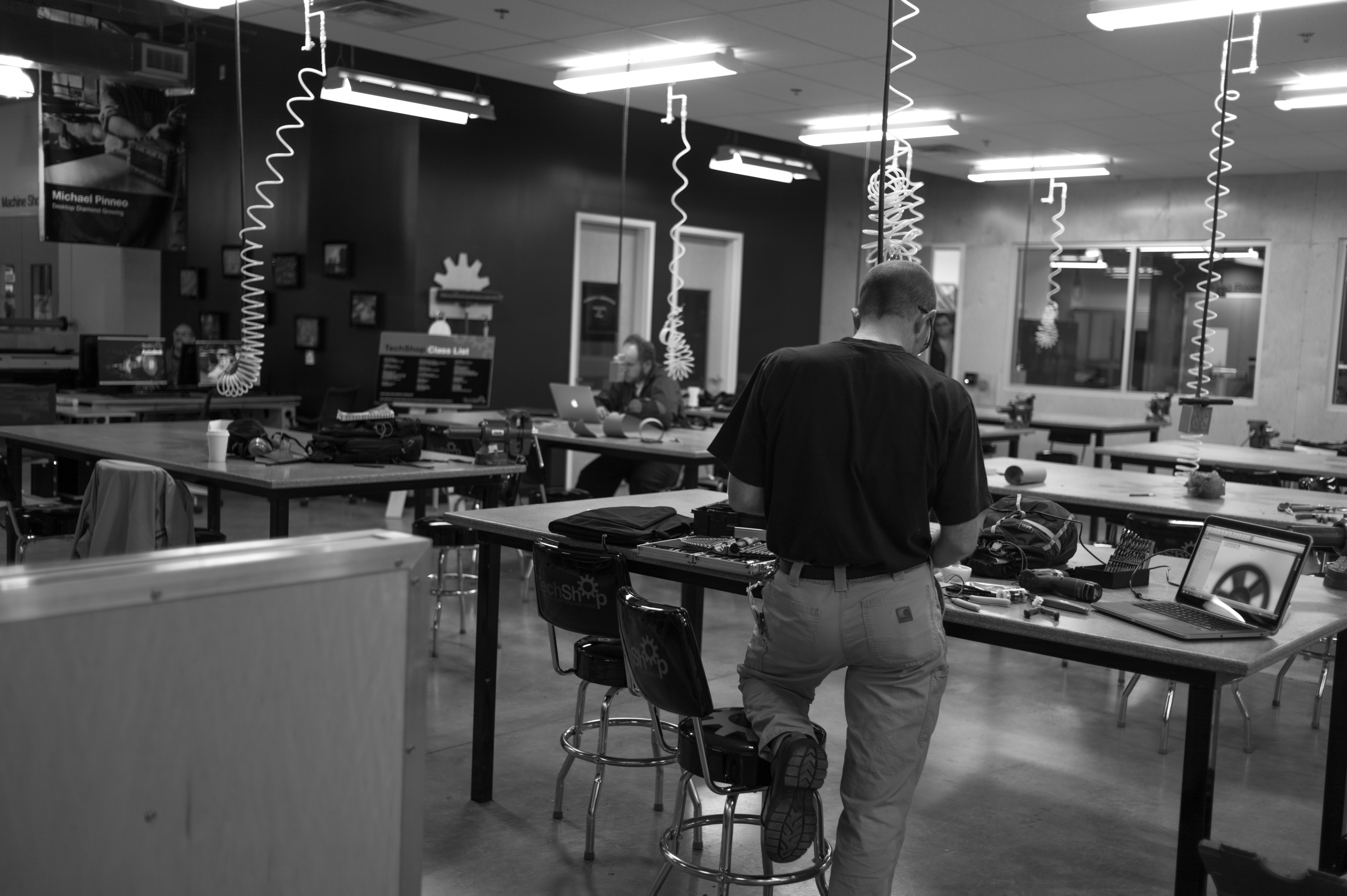 The photograph captures a creative workshop environment, emphasizing a blend of focus and collaboration. A lone figure diligently works at a table, surrounded by tools and projects, while soft overhead lighting casts a gentle glow across the expansive, cluttered space. The monochrome palette enhances a sense of industriousness and calm, inviting viewers to contemplate the process of creation within this communal setting.