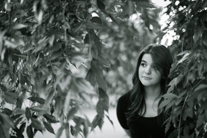 In a serene black-and-white setting, a young woman gazes thoughtfully, partially obscured by a curtain of lush foliage. The soft lighting accentuates her contemplative expression, creating an intimate mood that draws the viewer into her world. The composition, with the leaves framing her face, enhances the sense of tranquility and connection to nature.