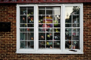 This photograph captures a window adorned with vibrant paper birds and festive decor against a backdrop of aged brick. The colorful decorations contrast with the weathered windowpane, creating a playful yet nostalgic atmosphere. Soft, natural light filters through, enhancing the warmth and inviting curiosity about the life within.