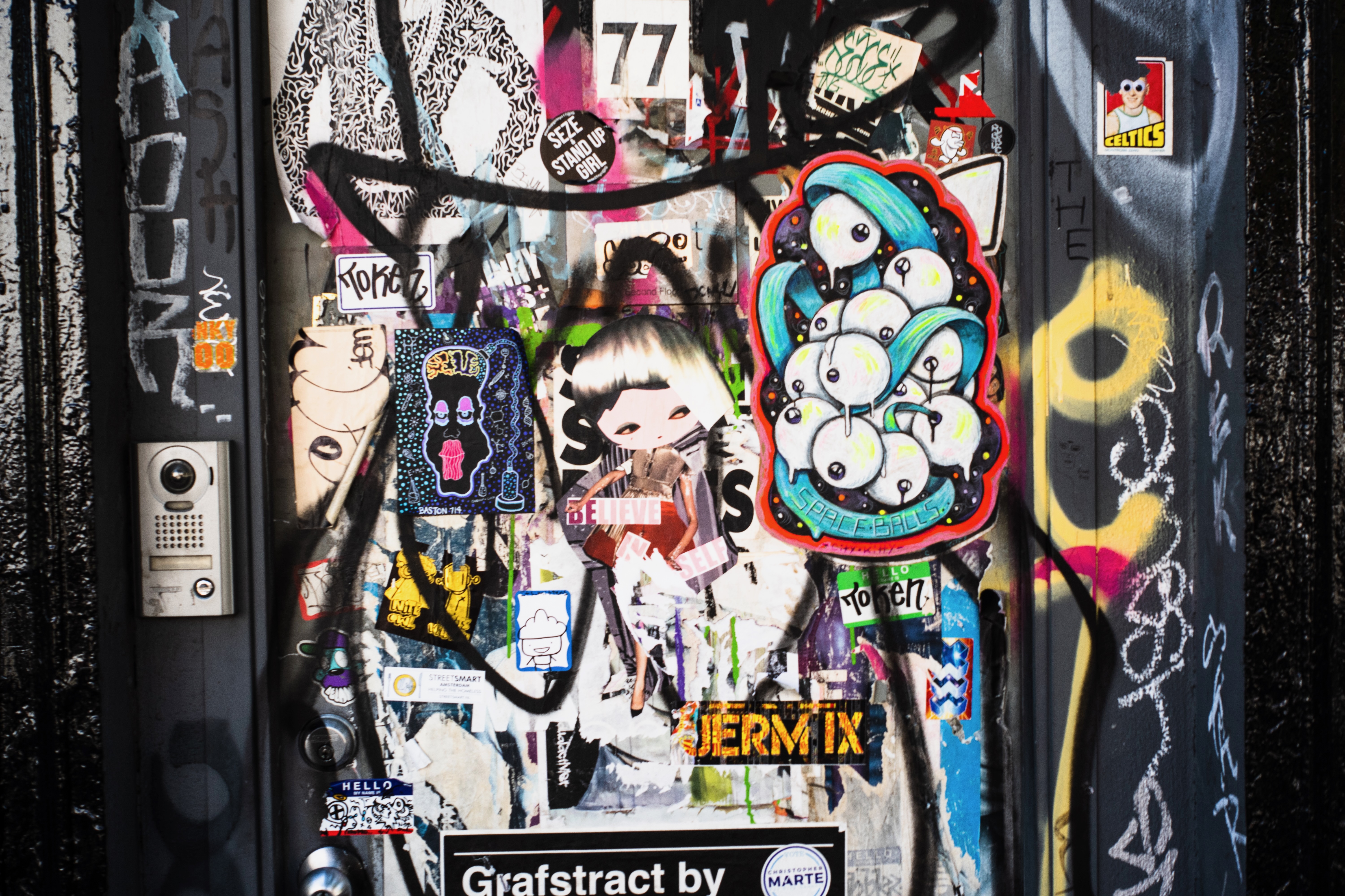 This photograph captures a vibrant collage of graffiti and stickers plastered on a door, showcasing an eclectic mix of colorful designs and artistic styles. The composition is chaotic yet intriguing, with overlapping layers creating depth and inviting closer inspection. The natural light enhances the vivid colors, evoking a raw, urban energy that speaks to the pulse of street art culture.