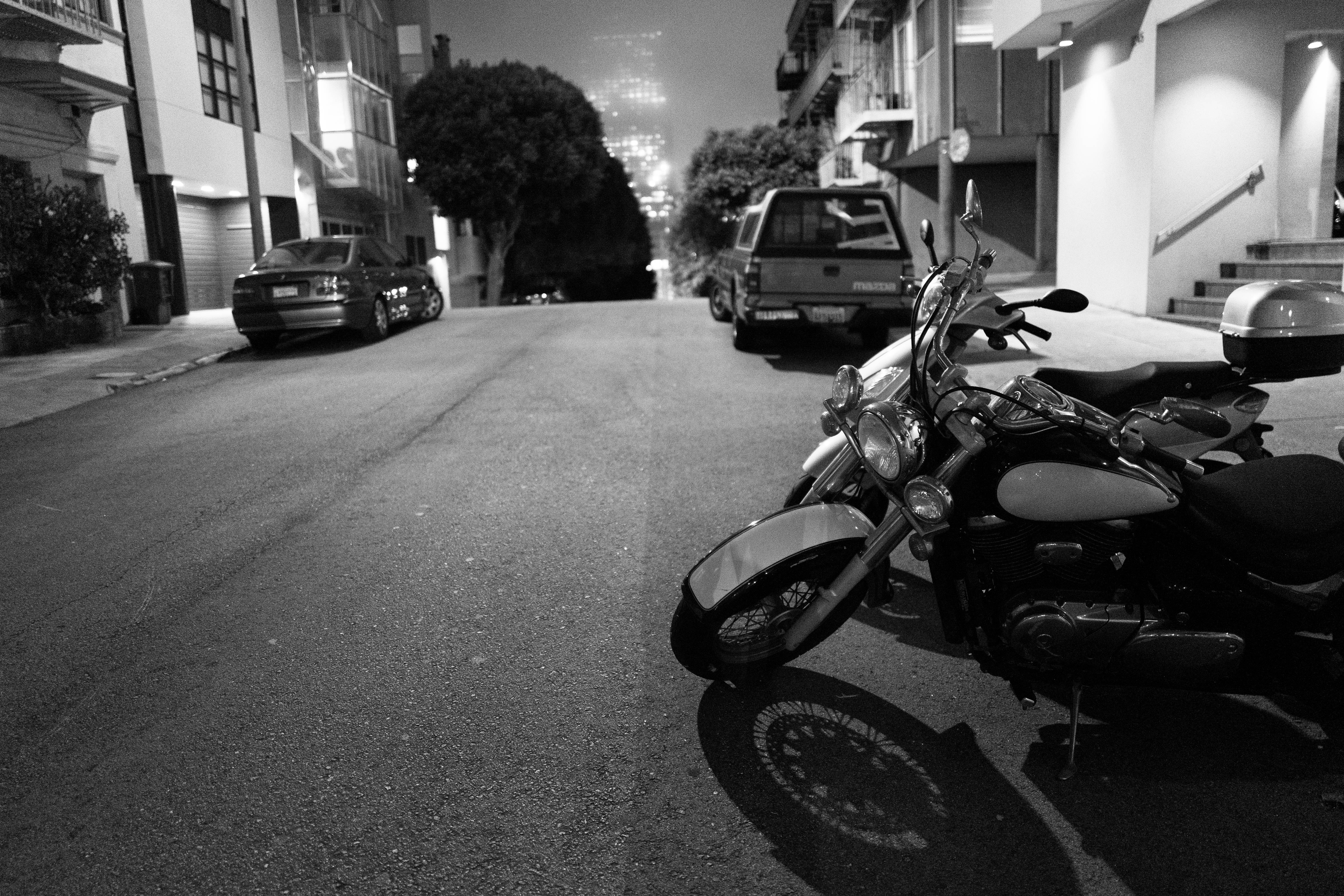 A solitary motorcycle leans against a quiet street, bathed in soft monochrome shadows. The atmosphere is melancholic and contemplative, accentuated by the distant glow of city lights peeking through fog. The composition draws the eye along the empty road, enhancing the sense of stillness and solitude.