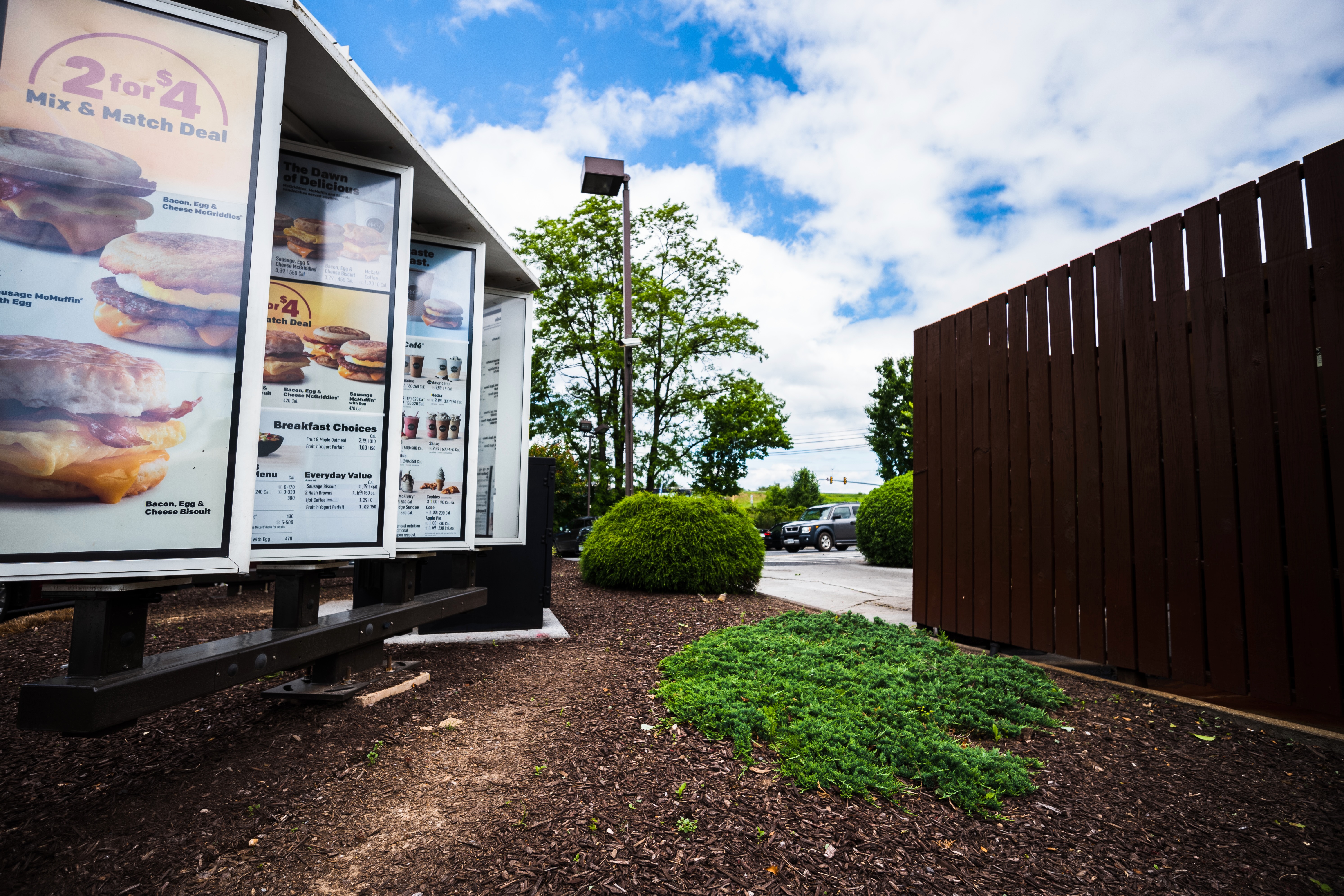 The photograph captures a busy drive-thru setting, with a vibrant menu board prominently displayed in the foreground. Soft lighting illuminates the scene, highlighting the lush greenery and inviting atmosphere, while cloudy skies add a touch of tranquility. The composition draws the eye from the menu to the bustling road beyond, hinting at a lively morning rush.