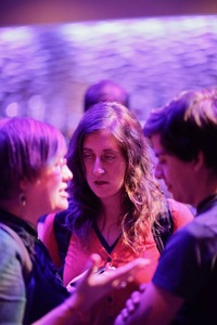 The photograph captures a tense yet intimate conversation among three individuals, their faces illuminated by a soft purple light that adds an ethereal quality to the scene. The focus shifts between the women, emphasizing emotions ranging from concern to contemplation, creating a layered narrative of connection and unease. The blurred background enhances the sense of intimacy, drawing the viewer into the moment.
