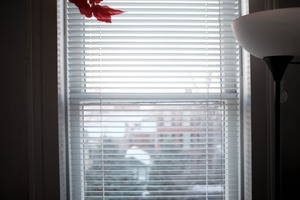 The photograph captures a serene moment through a window adorned with a vibrant red ornament, hinting at a festive mood. Soft light filters through the closed blinds, casting gentle shadows and highlighting the subtle textures of the room, creating an atmosphere of calm. Outside, a blurred winter scene adds a sense of quiet stillness to the composition, inviting reflection.