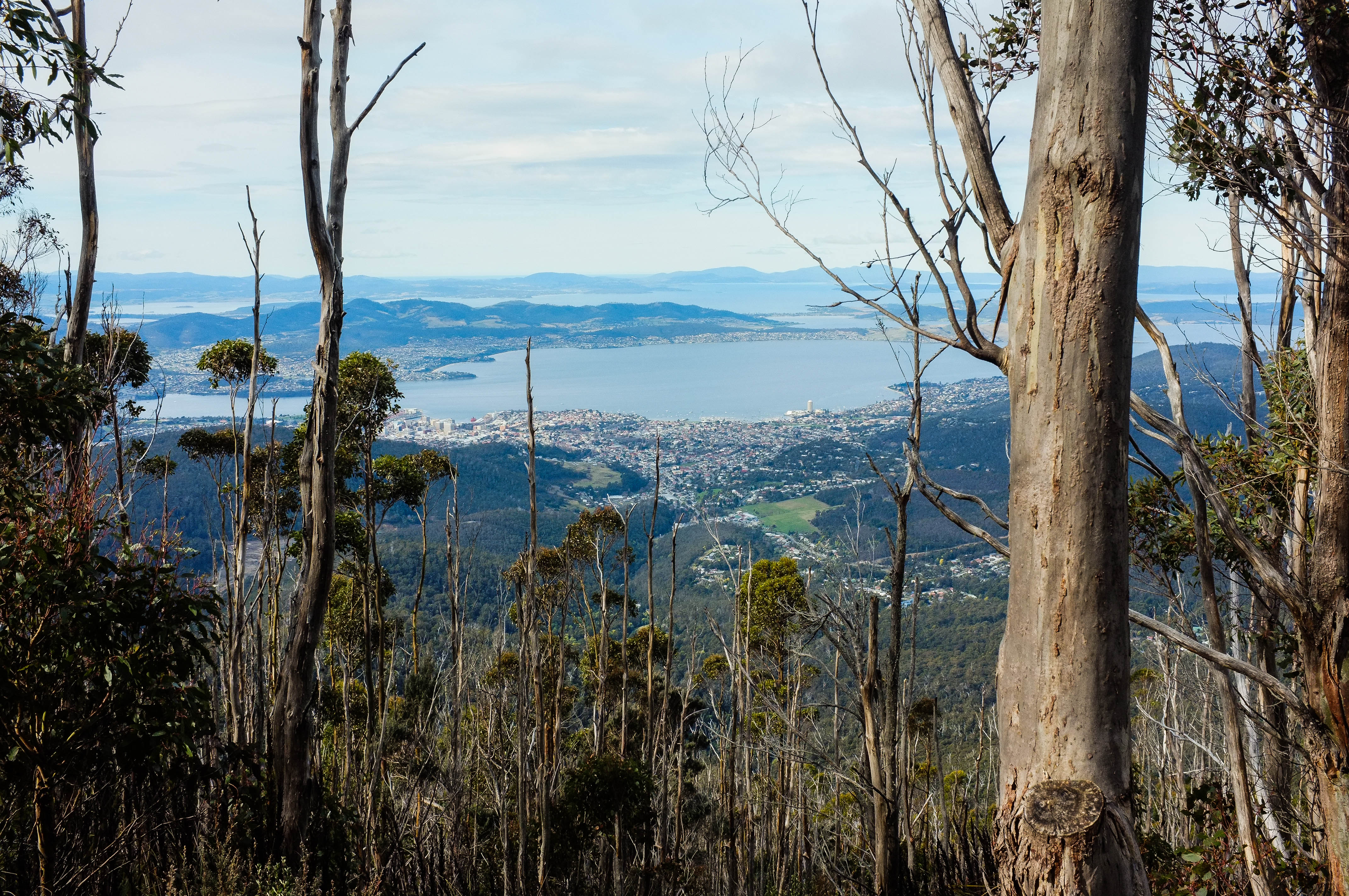 In this serene landscape, the photograph captures a panoramic view from a mountainside, offering a glimpse of a coastal town nestled by the water. Tall, slender trees frame the scene, their branches stretching towards the soft, overcast sky, creating a tranquil atmosphere. The subtle hues in the landscape enhance a sense of calm, inviting the viewer to soak in the natural beauty.