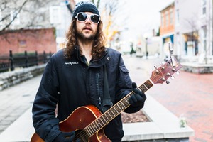 A lone musician stands in a quiet, empty street, clutching his guitar with a calm yet introspective expression. The muted lighting casts a cool, soft glow, highlighting his unhurried presence amidst the surrounding buildings. His stylish sunglasses and warm clothing suggest a mix of resilience and artistry, evoking a poignant blend of isolation and creativity.
