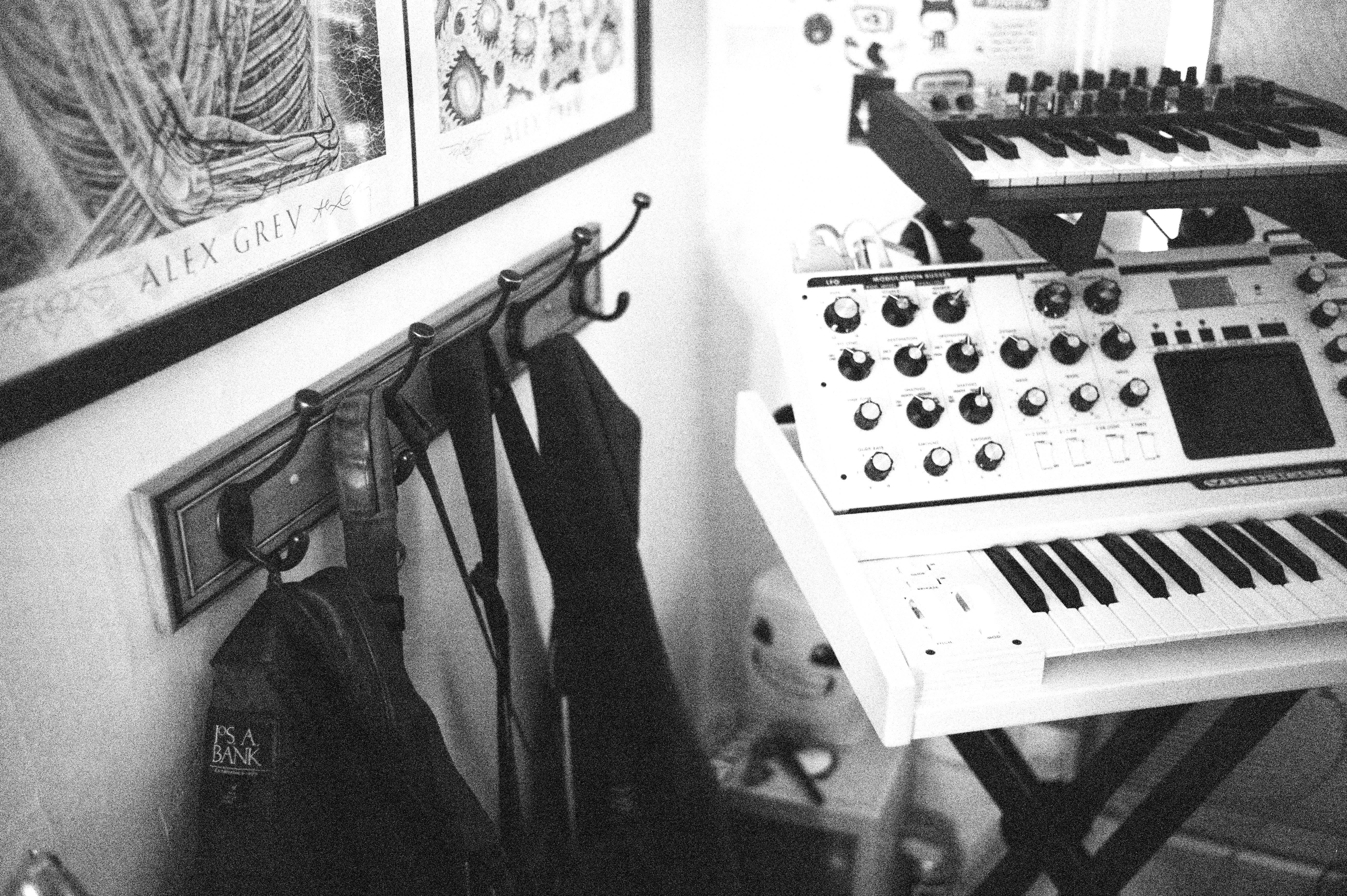 The photograph showcases a cozy, artistic corner filled with musical instruments and eclectic decor. The monochromatic tones evoke a nostalgic yet energetic vibe, inviting creativity and inspiration. Subtle lighting highlights the textures of the hangers and keyboards, creating a harmonious balance between art and sound.