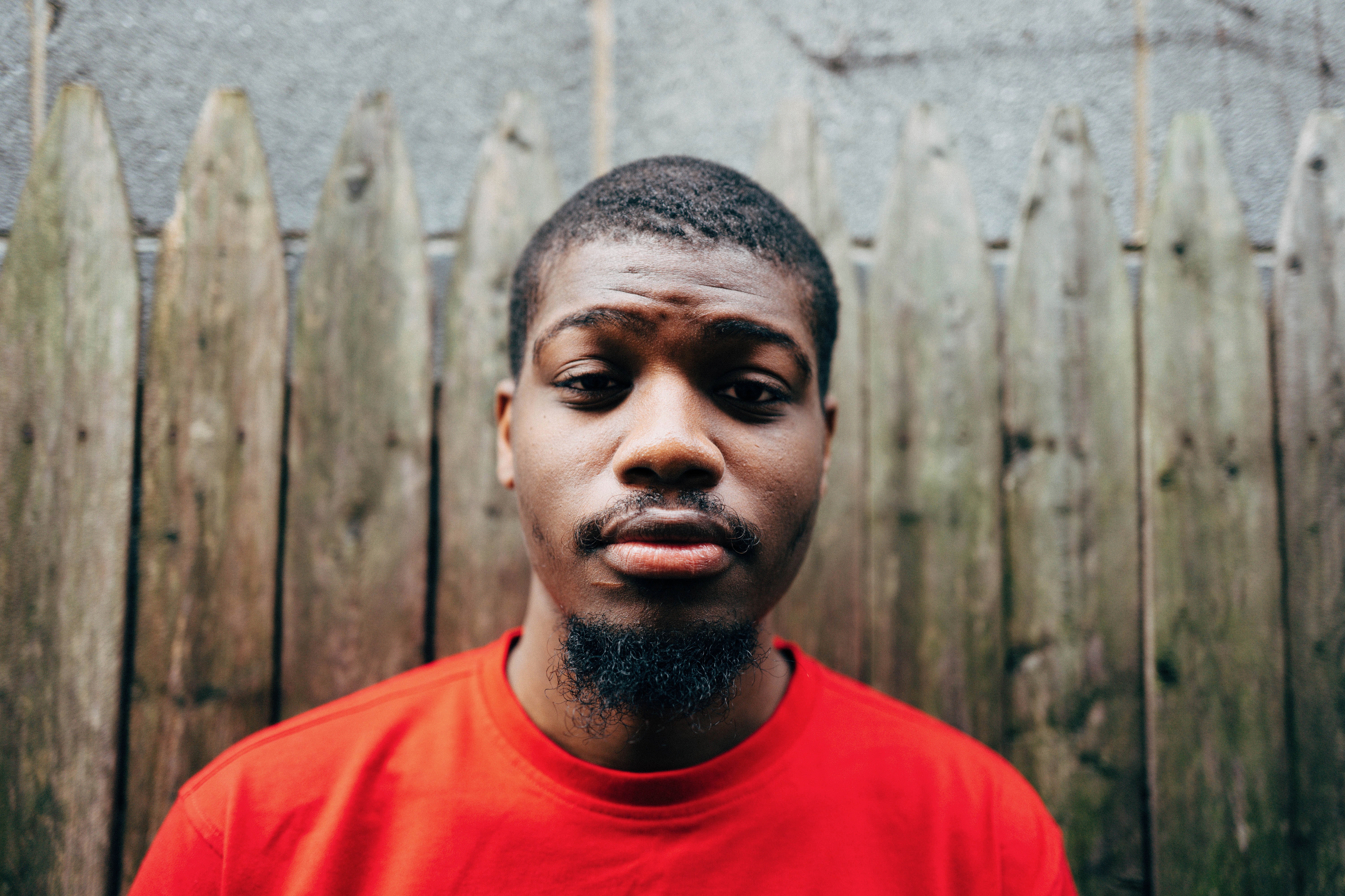 The photograph captures a solemn young man in a vibrant red shirt, standing against a rustic wooden fence. The soft, diffused lighting highlights his thoughtful expression, creating a mood of introspection. The composition draws the viewer's gaze to his contemplative face, contrasting the natural textures of the fence behind him.