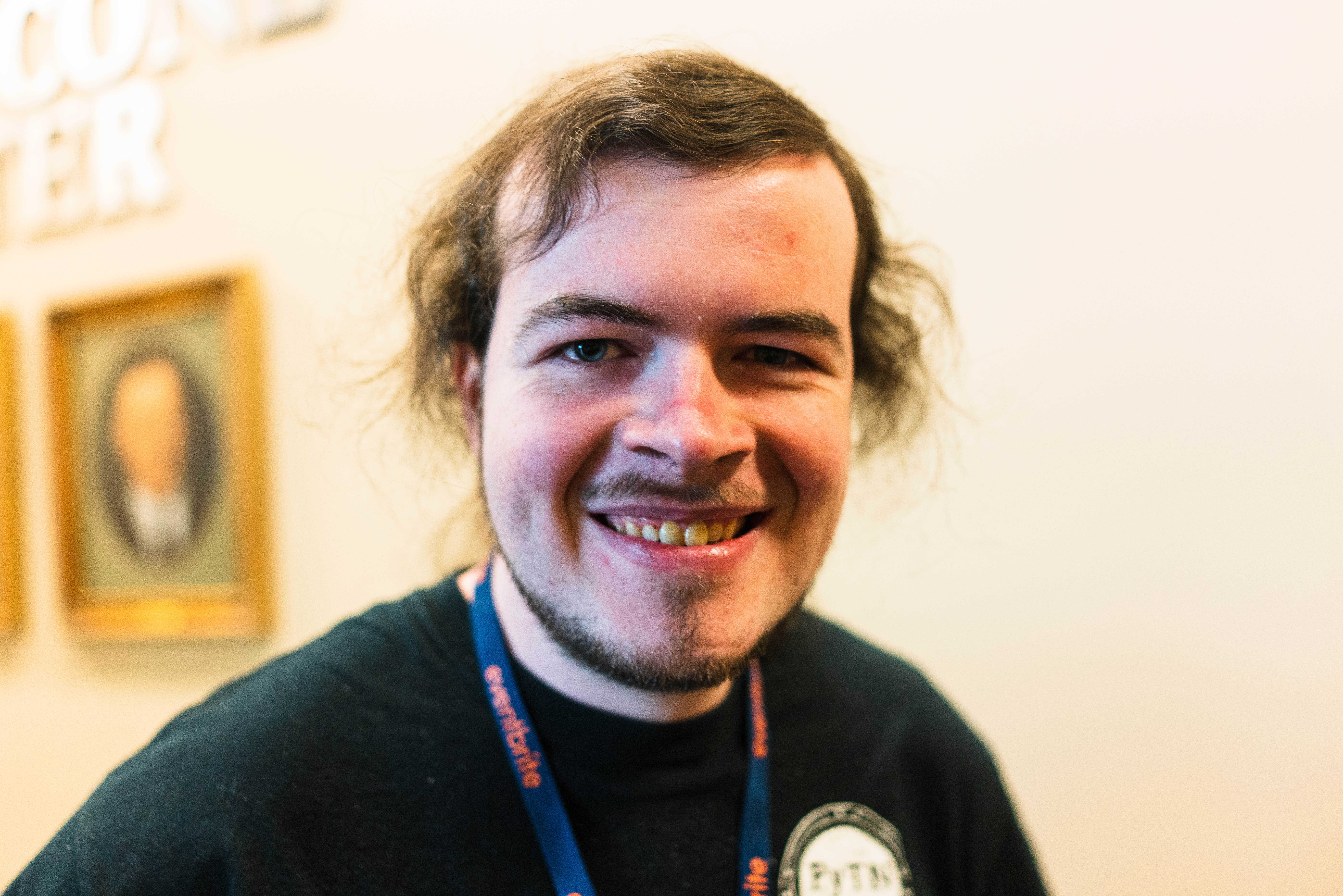 This portrait captures a young man with a warm smile, exuding a sense of friendliness and approachability. The soft lighting highlights his features against a muted background, allowing his expression to take center stage. The subtle details in his casual attire and the faint illumination from the wall behind add depth to the cheerful ambiance of the moment.