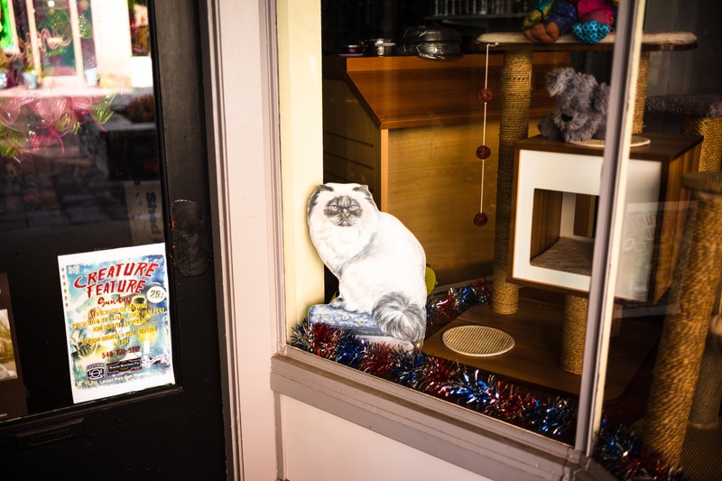 In a quaint shop window, a lifelike figure of a fluffy cat rests atop a vibrant, tinsel-lined shelf, exuding a playful charm. Warm, inviting lighting highlights the details of the scene, creating a cozy atmosphere that draws the viewer in. Surrounding elements, like a playful poster and colorful toys, enhance the whimsical mood of this charming display.