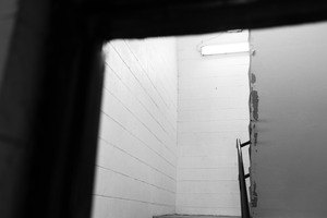 This black and white photograph captures the stark, minimal interior of a stairwell, where a single fluorescent light illuminates peeling walls. The composition draws the viewer's gaze upward, evoking a sense of both isolation and contemplation, as shadows play around the corners. The stark contrast in tones enhances the mood, creating a feeling of quiet unease amidst the sterile environment.