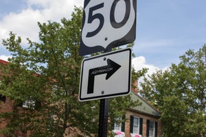 The photograph captures a road sign indicating Route 50, juxtaposed with an additional directional sign that leads to a website. The mood is casual and contemporary, enhancing a sense of urban life. Bright daylight and scattered clouds provide a crisp, inviting atmosphere, drawing attention to the signs amidst the greenery and architecture in the background.
