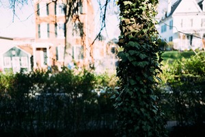 This photograph captures a vertical tree trunk entwined with vibrant green ivy, set against a softly blurred backdrop of suburban architecture. The interplay of light creates a warm, inviting mood, enhancing the contrast between nature and the man-made structures. The composition draws the viewer's eye towards the trunk, evoking a sense of tranquility amidst the urban environment.