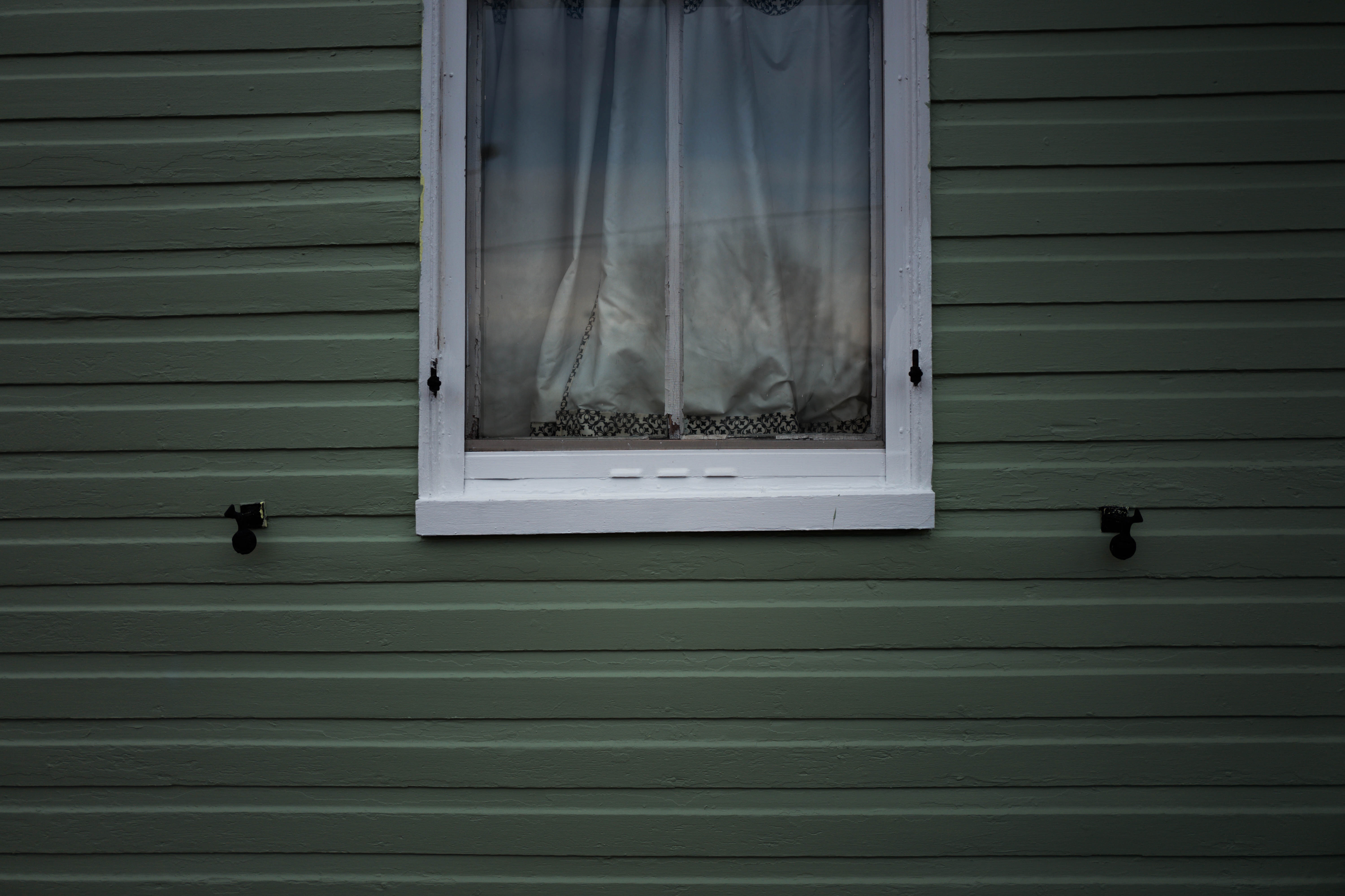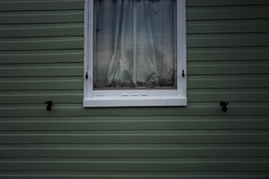 A solitary window, framed by muted green wooden siding, captures a poignant moment of stillness. The sheer curtain softly diffuses light, hinting at life within while casting a gentle shadow on the exterior. The minimalist composition evokes a sense of solitude and introspection, inviting viewers to ponder the stories hidden behind the glass.