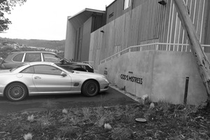 The photograph captures a sleek silver sports car parked in front of a minimalist modern building, juxtaposed against a faded wall displaying the provocative phrase 'GOD’S MISTRESS.' The black-and-white aesthetic heightens the tension between luxury and the stark urban backdrop, evoking a sense of irony and contemplation in this unusual setting.