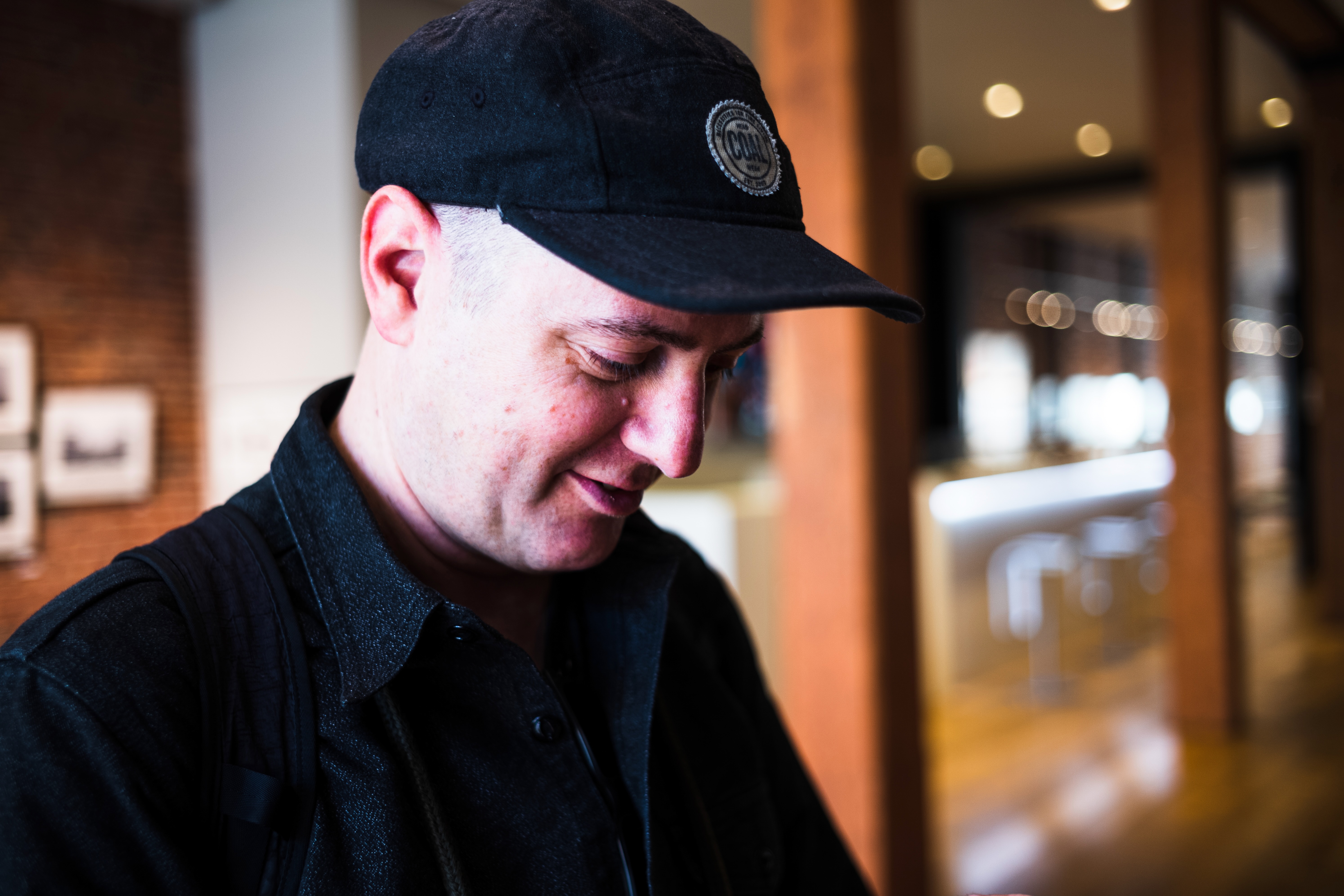 A man in a black cap is captured in a moment of quiet reflection, his gaze directed downwards. The soft, natural lighting creates a warm and inviting atmosphere, while the blurred background hints at a contemporary setting, drawing focus on the subject's thoughtful demeanor. Subtle textures from the surrounding environment accentuate the mood of introspection and tranquility.